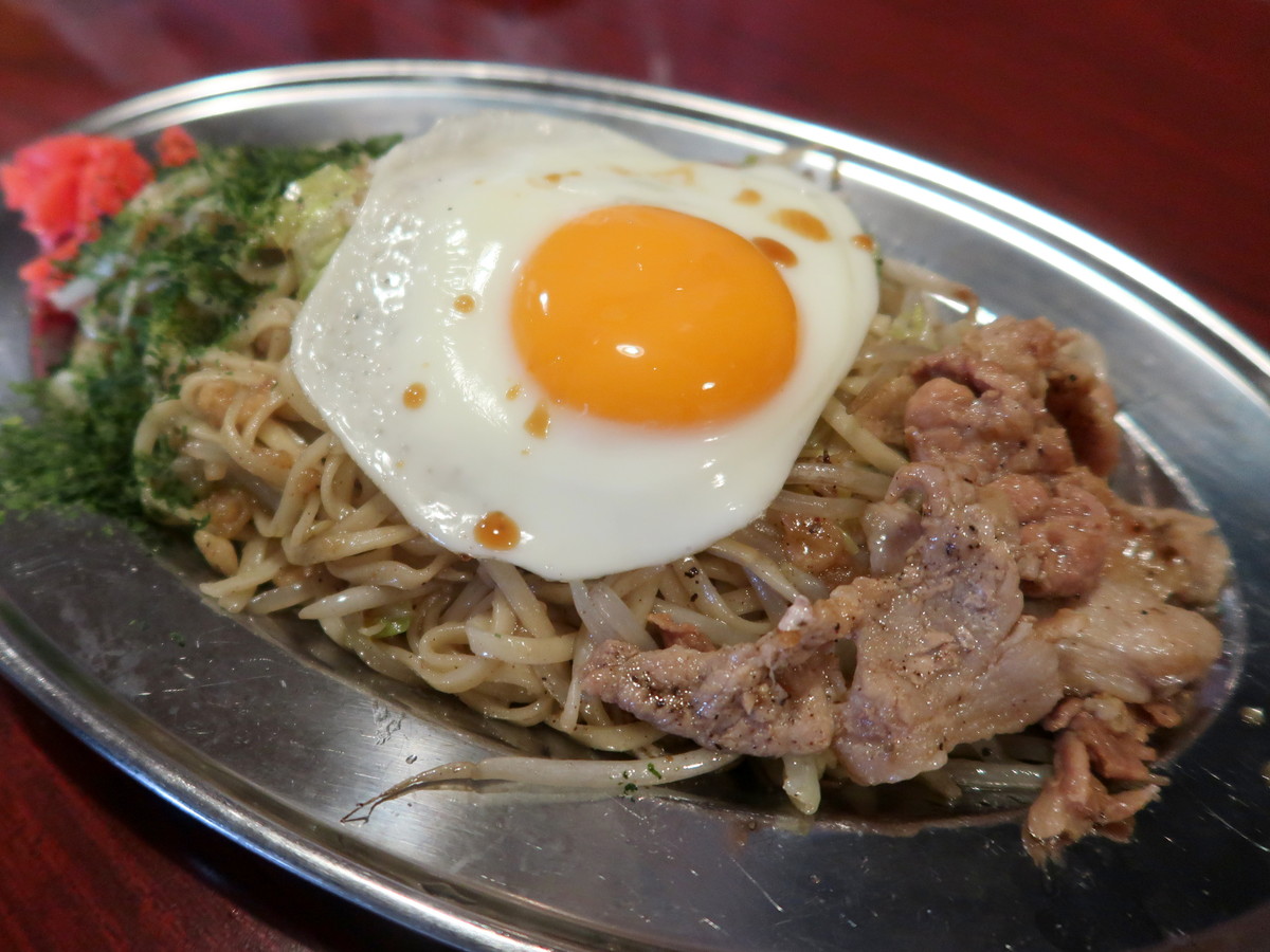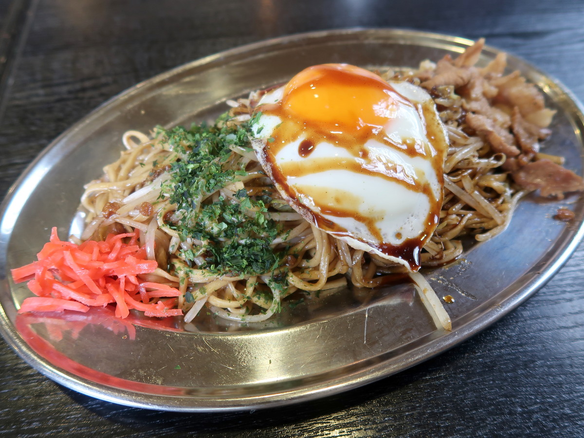 麺は地元の太洋軒製麺所から仕入れた、北海道産小麦100%の平打麺。注文を受けたら綾子さんが生麺を茹であげて流水で締め、それを知美さんが鉄板で炒める。モヤシ・キャベツ・揚げ玉と混ぜ炒め、豚肉・目玉焼きなどをトッピングし、仕上げのソースをかけてできあがりだ。
