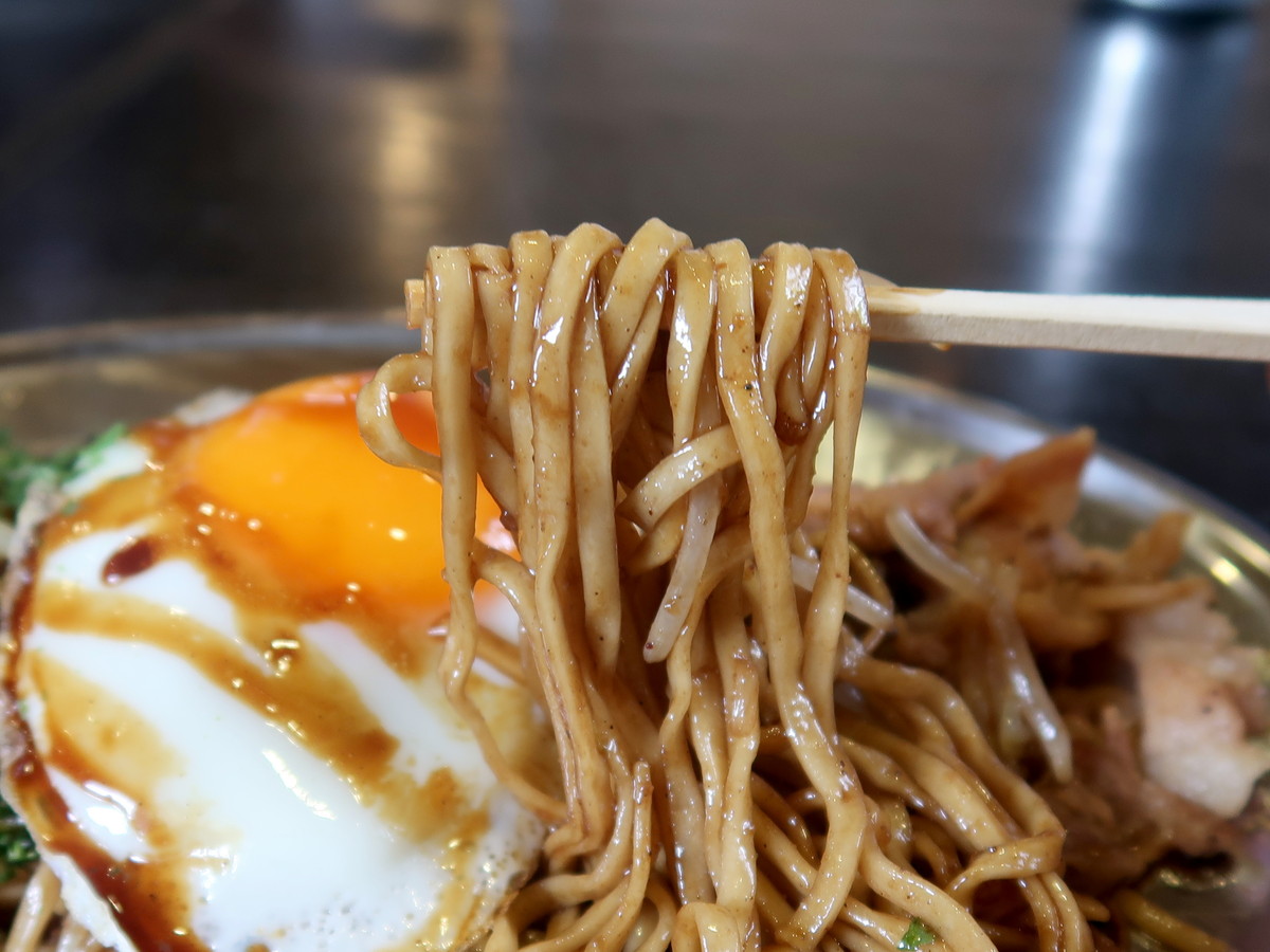 モチモチの平打麺にソースがしっかりとまとわりついて、めっちゃウメーン! 麺を水で締めることでツルツルしたテクスチャも加わって、喉越しも楽しめる。あまりしっかり焼きすぎない方が、こちらでは好まれるらしく、あえて焼かないことを選択しているそうだ。